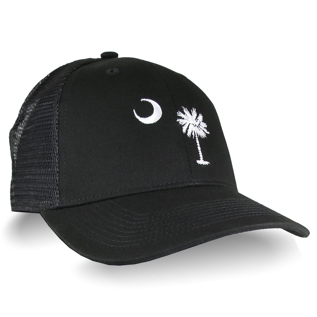 A South Carolina State Flag embroidery design embroidered on a black adjustable structured classic trucker style cap. It is a sturdy and comfy hat and a winning candidate for everyday wear as well as for making a fashion statement on, or off the beaten paths.